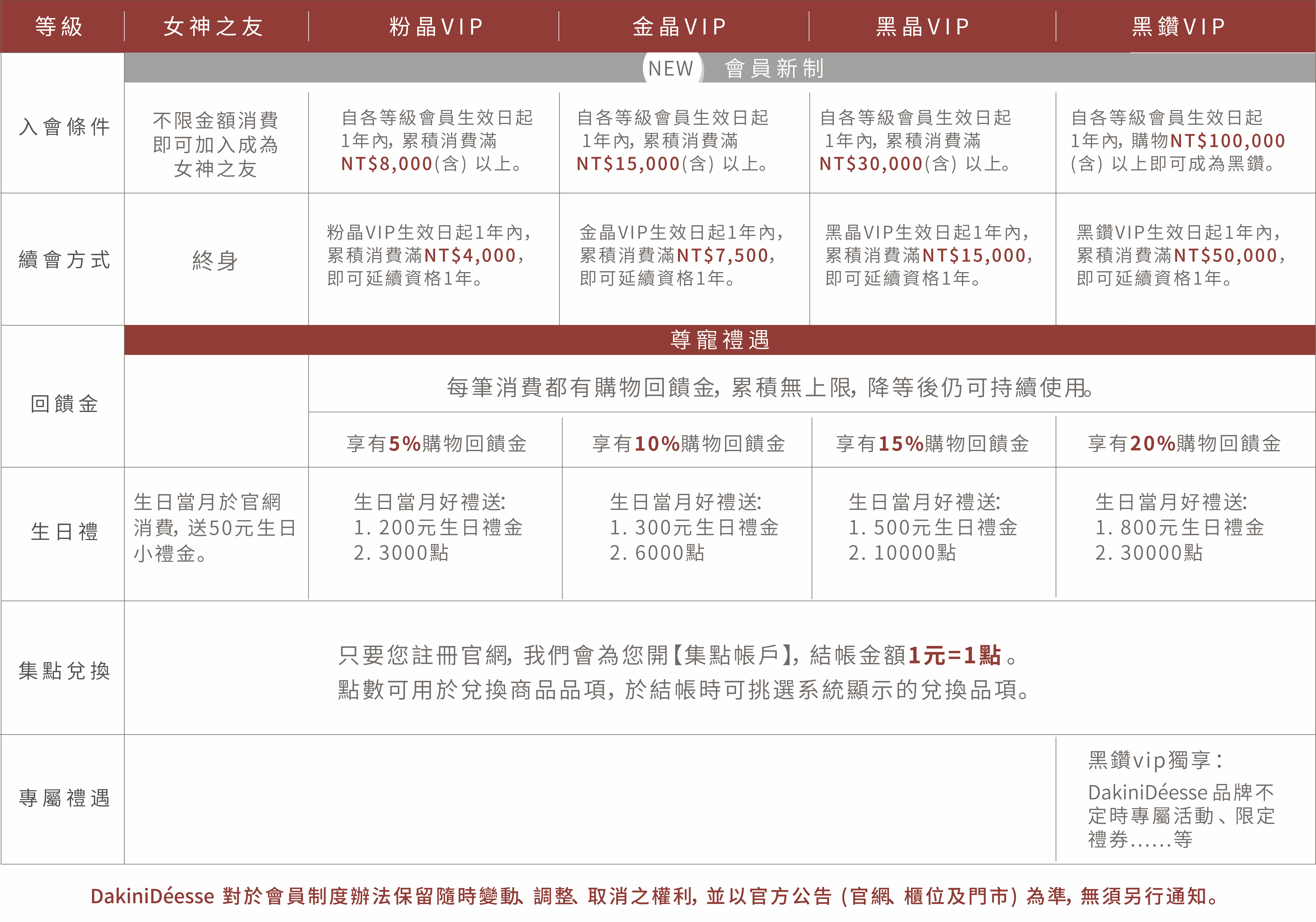 6. 形成會員達到續會、升等標準之該筆消費,若因退換貨導致累計金額未能達到其標準,DakiniDéesse官網有權調整會員資格,追回相關之購物回饋金、消費集點之點數。