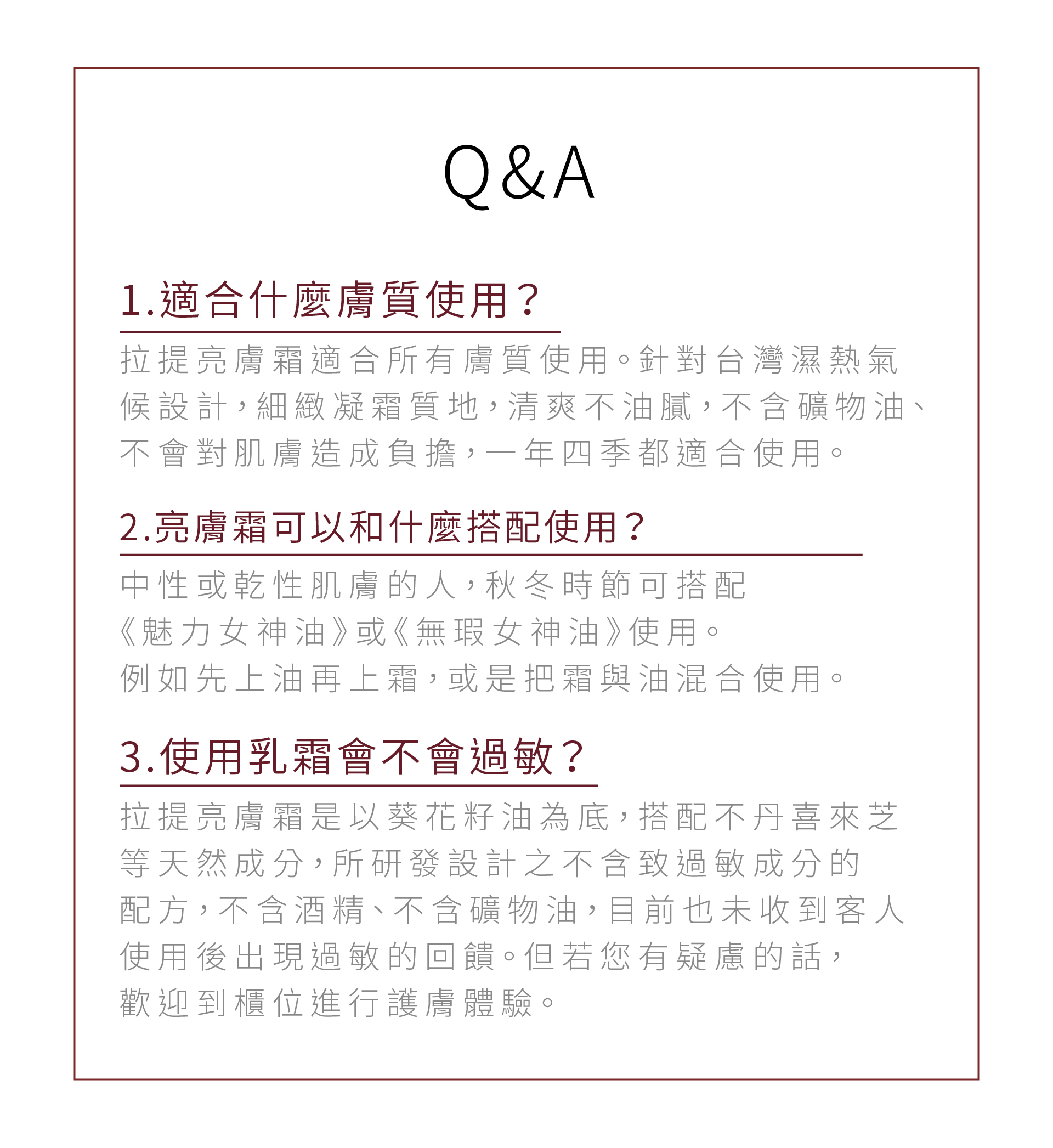 潤澤保濕、調理肌理,有效改善乾燥、細紋、暗沉,完美支撐肌膚結構,回復亮白,迅速修護,延緩老化。