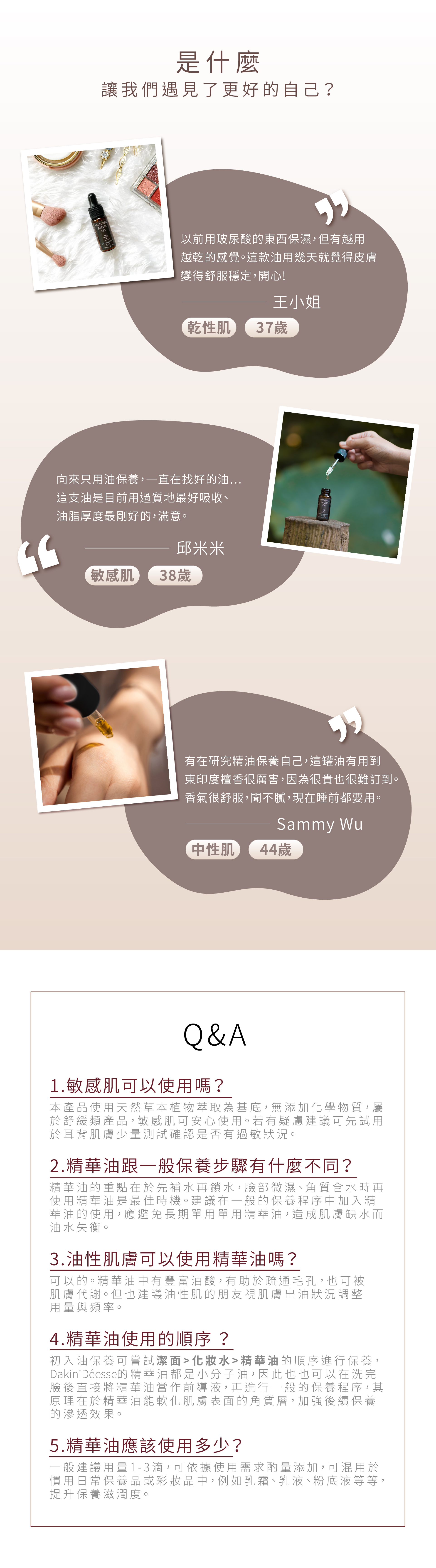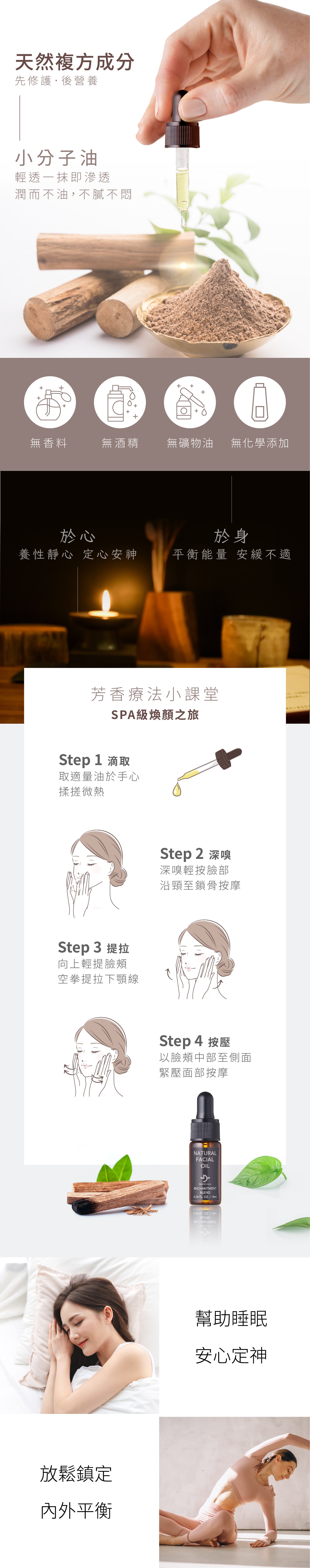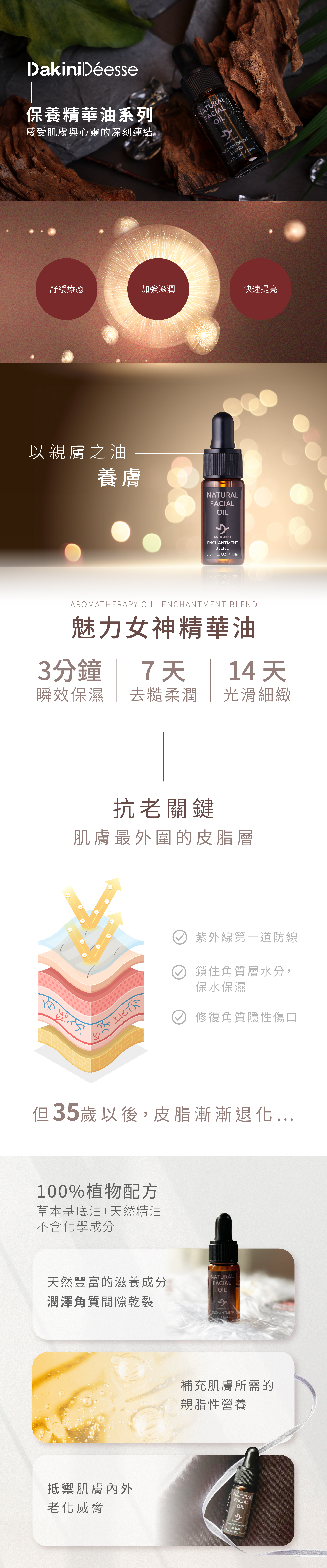 小分子油細緻滲透,親膚性極佳,專為乾燥和敏感肌膚設計,油性肌膚使用也不黏膩,是油保養的最佳選擇。