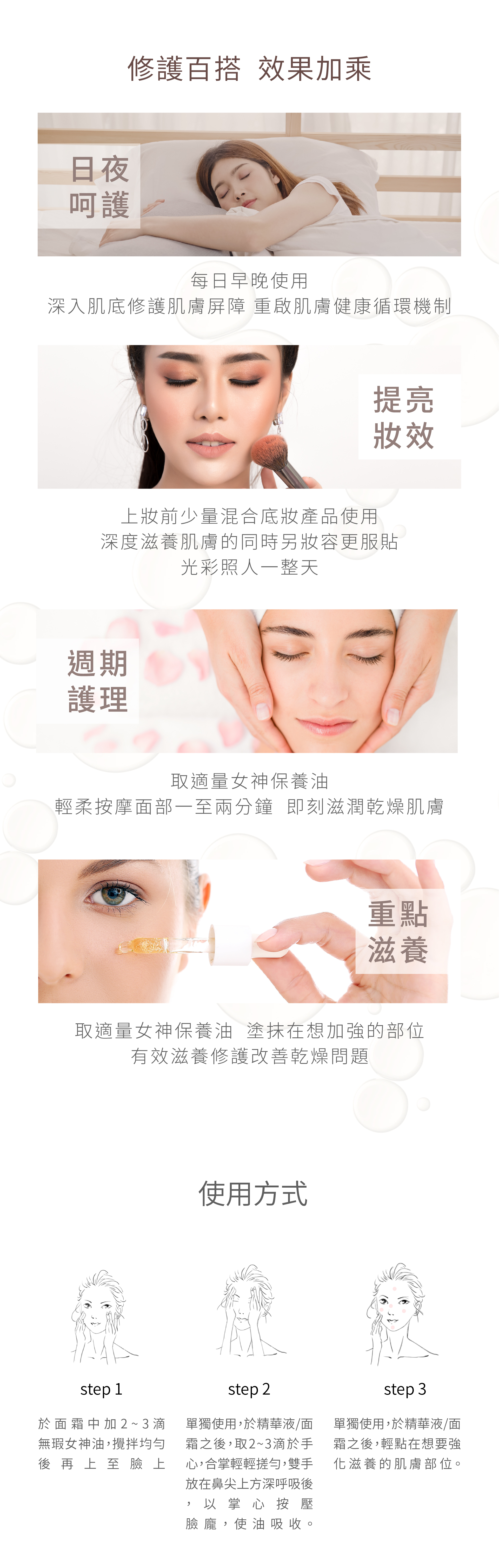 用於妝前保養可使妝感更透亮持久。專業芳療特調香氣,放鬆身心,自然釋放專屬於妳的獨特女性魅力。
