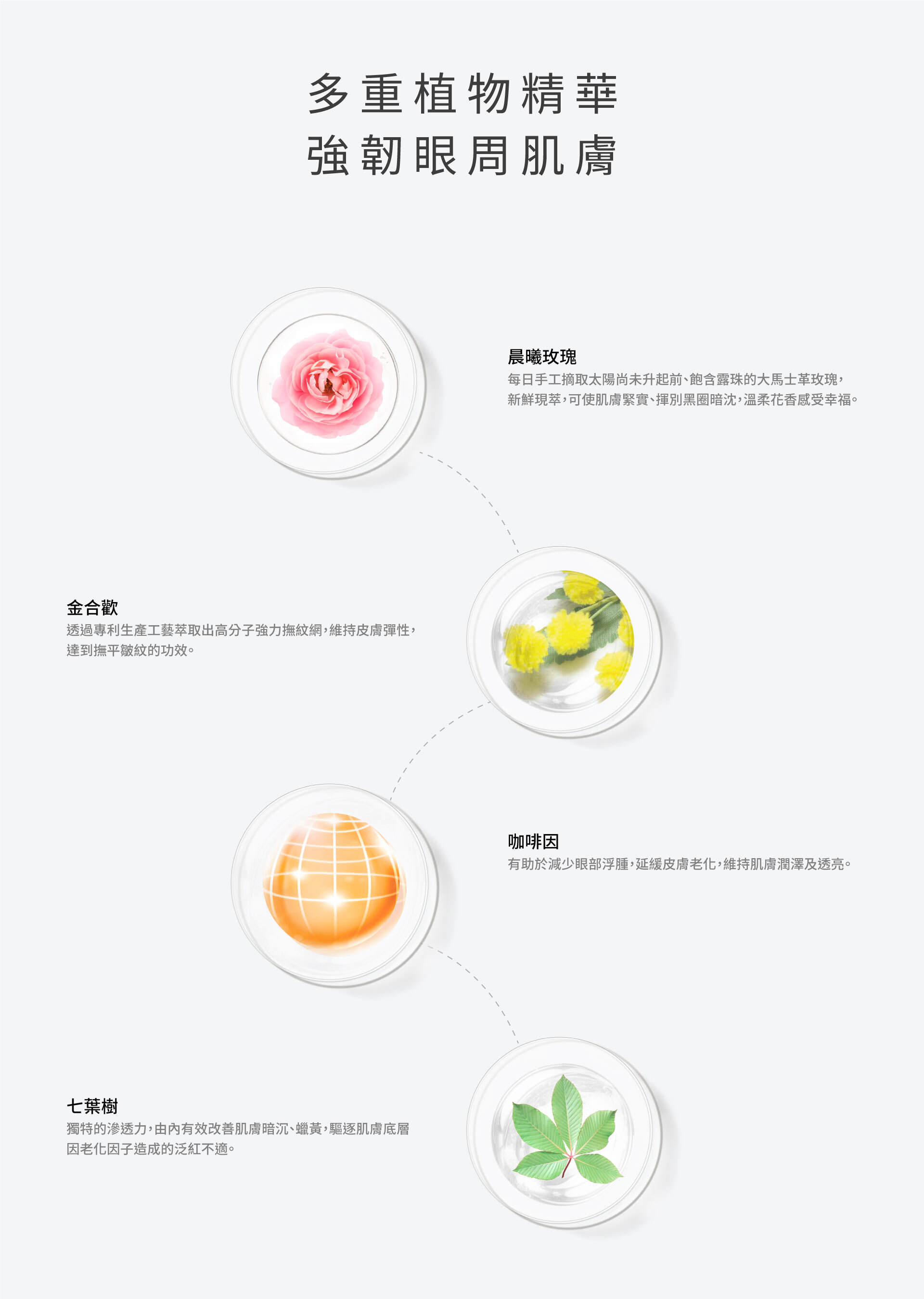 立即潤澤眼周肌膚並淡化及預防細紋生成,使肌膚重現飽滿明亮。